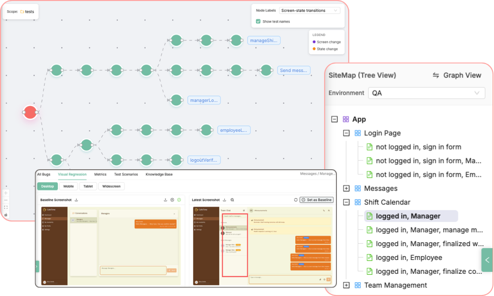 Stop drowning in false positives. Our context-aware engine compares new screenshots against an "approved baseline" for every screen-state to spot material regressions.