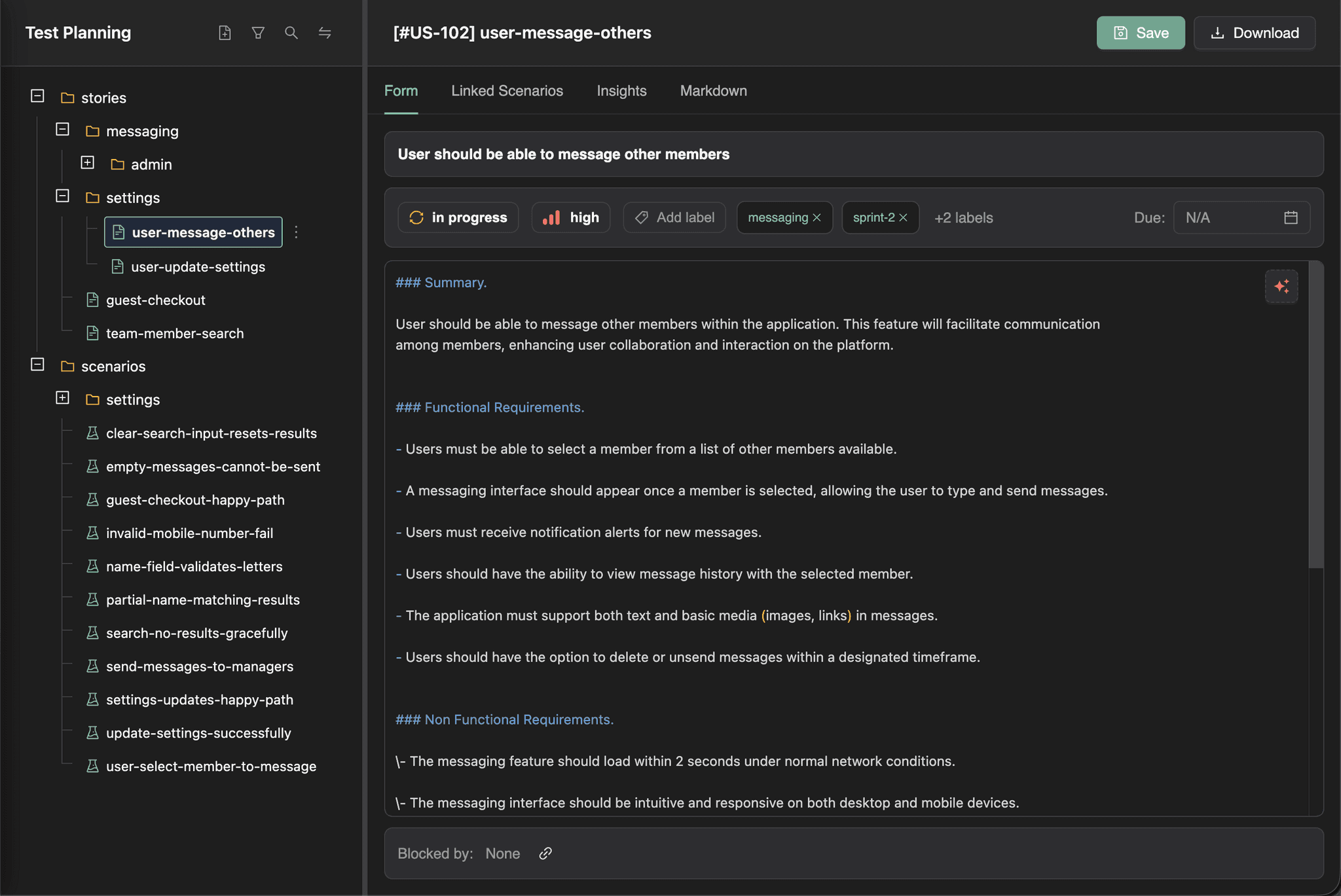 In TestChimp, user stories and test scenarios live as structured .md files, making them: